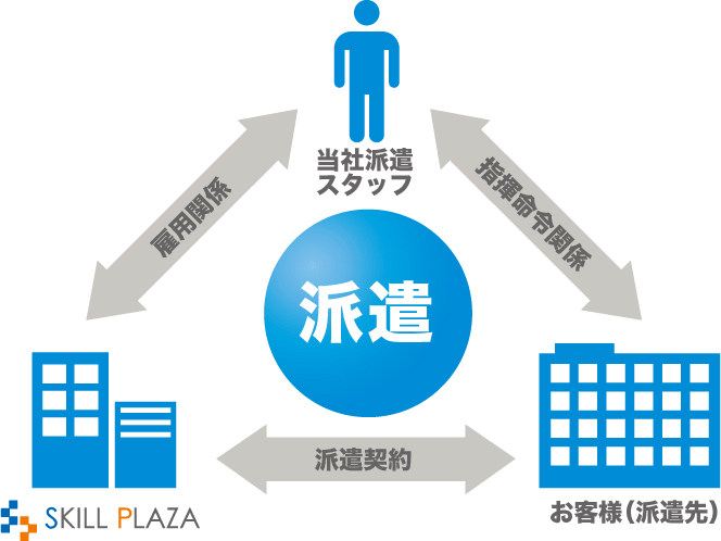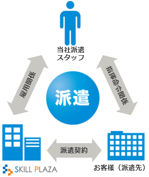 派遣元となるSKILL PLAZAに登録している人材を、派遣先となる事業所へ派遣し、派遣先の指揮命令のもとで労働力を提供する雇用形態サービスのことです。